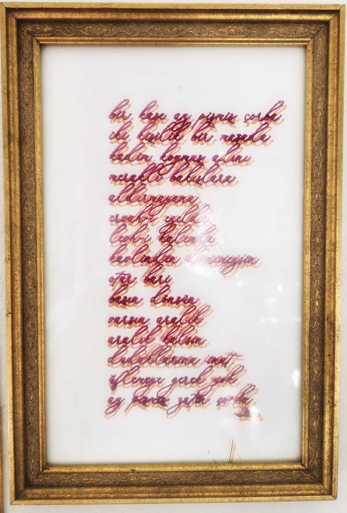 Years passed. The poem disappeared into a folder and waited. Then, one day, I fed it to a machine—a Makelangelo, a robot that draws with a hanging pen. Two motors, four strings, one slow heart. It traced each letter without knowing why. When it finished, the ink was uneven, a little nervous, exactly right. I framed it in gold. The kind of gold that tries to make things matter.